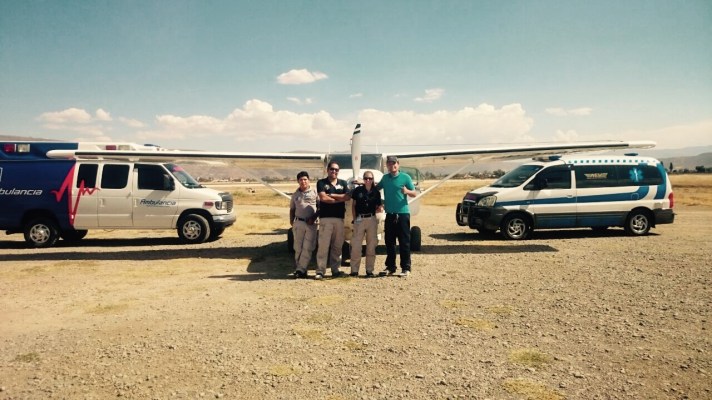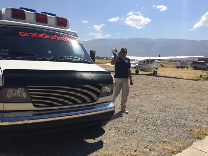Un collègue avant de partir avec la nouvelle ambulance et notre avion