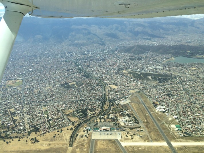 Nous survolons d’abord une ville proche de Cochabamba, puis les montagnes environnantes et enfin la ville elle-même. Quel plaisir de la découvrir sous un angle nouveau !