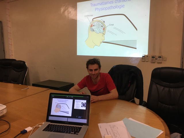 L’après midi se déroule bien, la glace est cassée, le ton de l’échange devient sympathique. Brève introduction sur le traumatisme crânien et du rachis puis on repart avec de la pratique. Arrive un moment qui restera dans ma mémoire. Au moment de terminer une immobilisation avec « le plan dur » (ou planche en suisse romande), on constate qu’il manque un système d’immobilisation de la tête. Du coup on roule une couverture, deux bandes élastiques et le tour est joué. Silence dans la pièce. On comprendra au moment de la clôture du cours que ce simple geste, nous rendra presque plus africains que les africains en matière de système D. Je retrouve la sensation d’une simple discussion entre professionnels du terrain. L’ADN de cette association, échanger. Fin de la journée. Une bonne Brakina fera du bien à l’équipe. On se réjouis aussi de retrouver Marine pour discuter de sa première journée de stage.