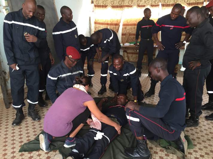 Cette précision faite, on part en salle de pratique, pour une simulation d’accident qui servira de fil conducteur de notre journée. On avait imaginé ensuite travailler en deux groupes de 10, en utilisant un apprentissage par problème. On va vite changer de stratégie. Discussion animée et controverse sur la prise en charge simulée. Corinne nous propose de faire la même situation, avec nos propres techniques. Retournement sur la planche, retrait du casque, pose d’un pansement compressif, immobilisation. A nouveau discussion très animée. Ca va être chaud. Retour en salle de théorie pour débriefer le tout puis ajouter un peu de contenu théorique sur le garrot et la pose de la ceinture pelvienne. Finalement rien de plus pratique qu’une bonne théorie (IFFP, Lausanne, 2009, auteur j’m souviens plus). Fin de la matinée, on part manger dans l’hôtel d’en face. Un poulet Yassa et hop de retour au boulot.