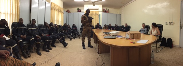 Un nescafé bien serré, un bonjour et un sourire chaleureux de notre ami Rostone et nous voilà « presque » en forme pour attaquer cette première journée d’échange. Marine en stage sur le terrain, Corinne, Mathieu et Florian en cours. 8h00, salle de théorie. Brève présentation de chacun des participants puis quelques mots sur l’association et le but de cet échange. Le thème de la journée est la prise en charge des traumatisés. Comme d’habitude un peu d’épidémiologie triée de documents de l’OMS. Les 10 premières minutes on se sent comme des marrons sur le feu. Débarque alors le Commandant du service, un garde à vous sec fini de nous réveiller ! On nous prie de le suivre dans le bureau du grand chef. On laisse nos 20 acolytes en salle de cours. Là je me dis que ça va pas aider à briser la glace (eh oui ! Aussi par 33° au Burkina). Politesses d’usage, questions sur le projet, le temps passe. Retour en salle de cours, les 20 pompiers, tous cadre du service, en pleine palabre. Moment de doute sur notre présence, notre légitimité à être là. Corinne demande au commandant, qui a été notre interlocuteur dès notre première rencontre, de venir insister sur le principe de ces trois jours : l’échange.