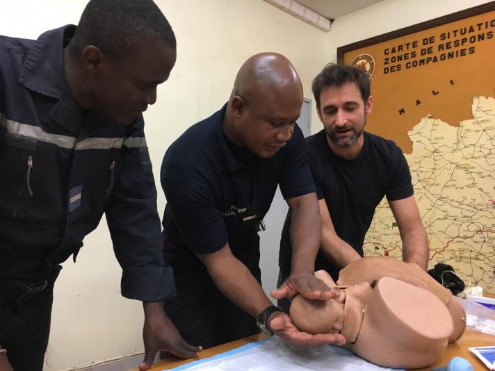 Anatomie, physiologie, déroulement de la grossesse, accouchement normal passionnent l’auditoire. Le passage à la pratique va nous réserver quelques francs moments de rigolades. Corinne, victime toute désignée, va accoucher un nombre incalculable de fois. « Soyez forte madame ! Poussez ! Allez, poussez ». Les situations se complexifient : cordon autour du cou, nouveau né en arrêt respiratoire, dystocie des épaules, hémorragie de la mère. Calmes et très professionnels, les sapeurs-pompiers de la BNSP assurent, particulièrement pour trouver des prénoms aux nouveau-nés du jour.