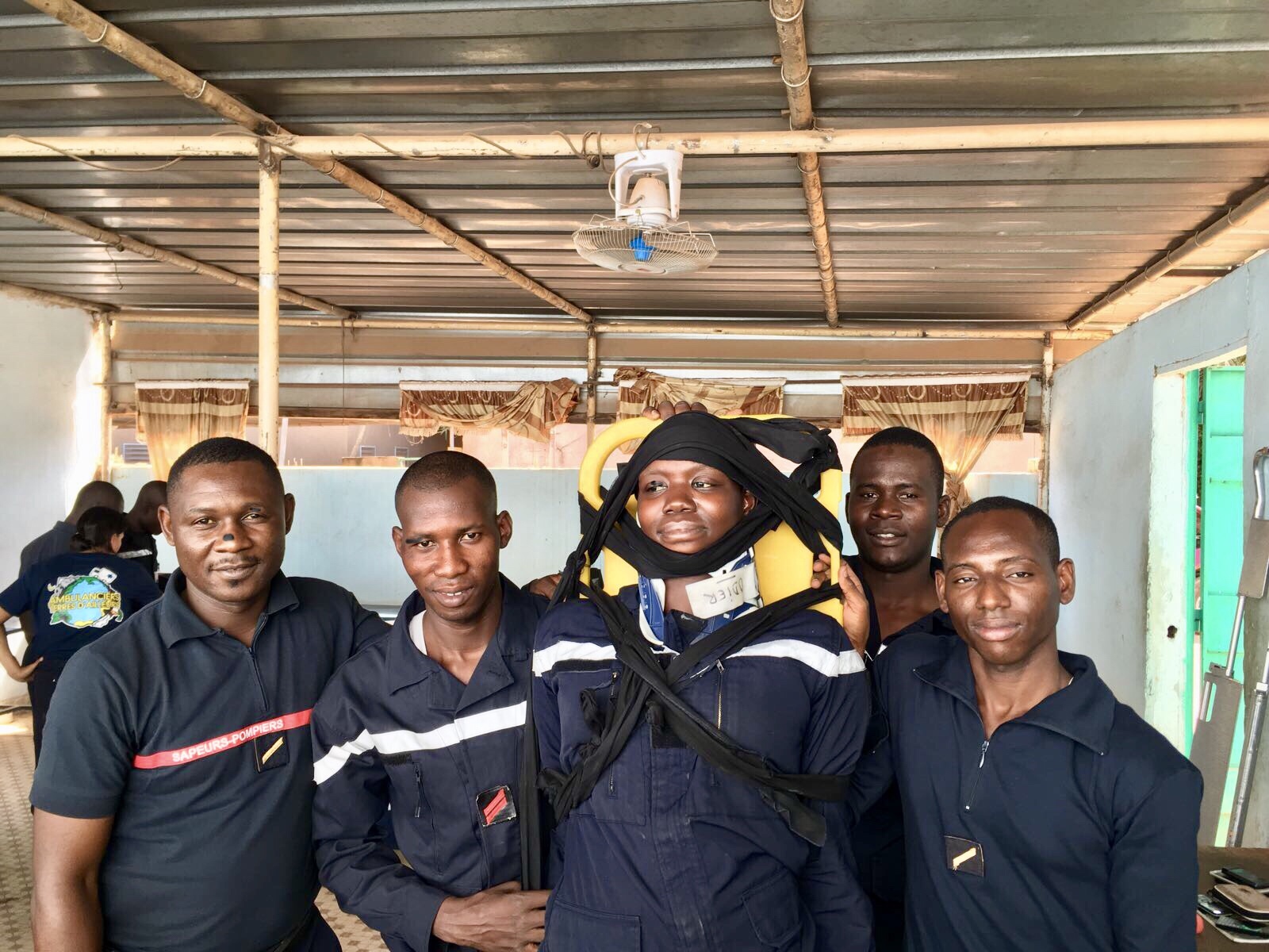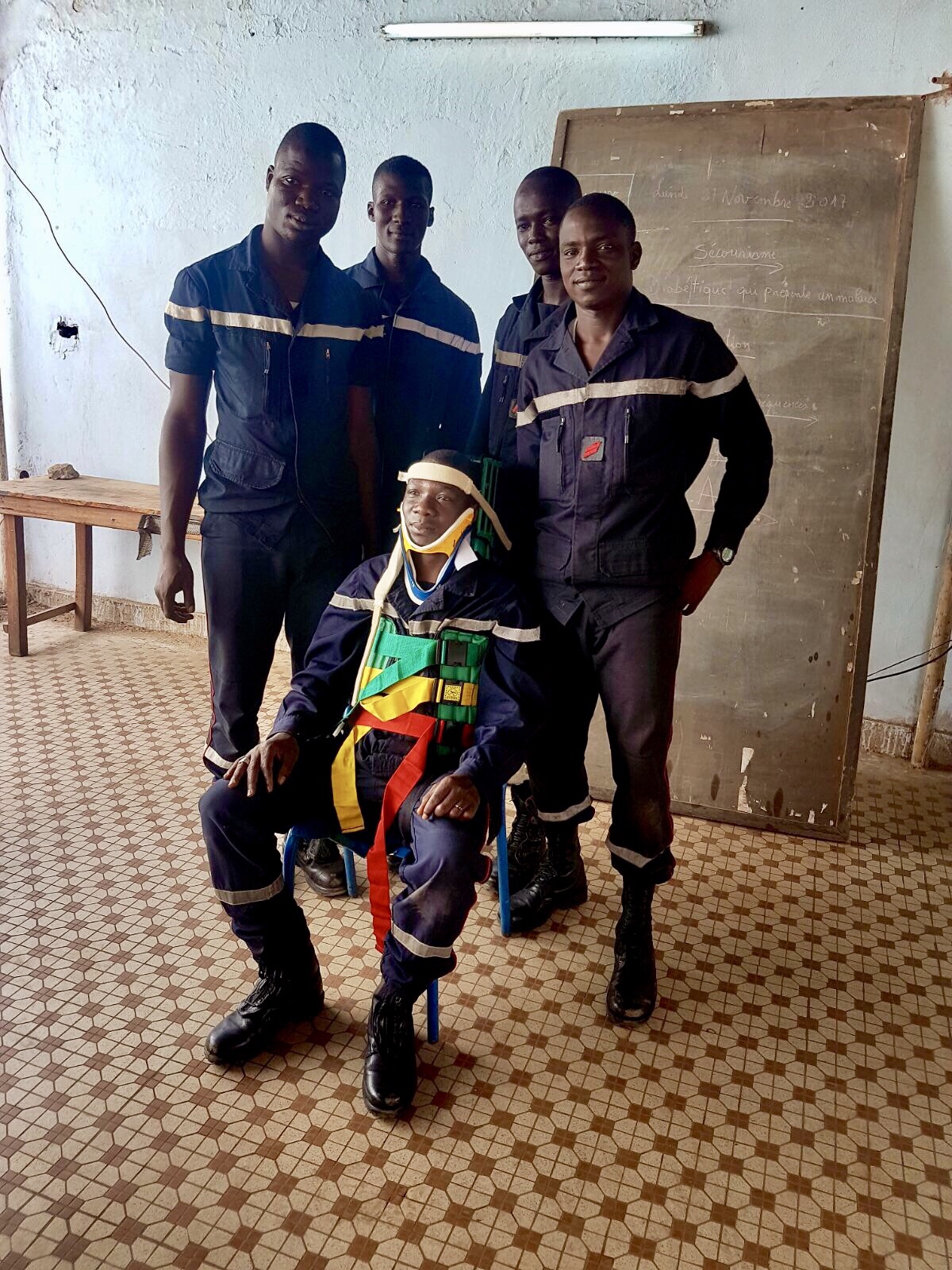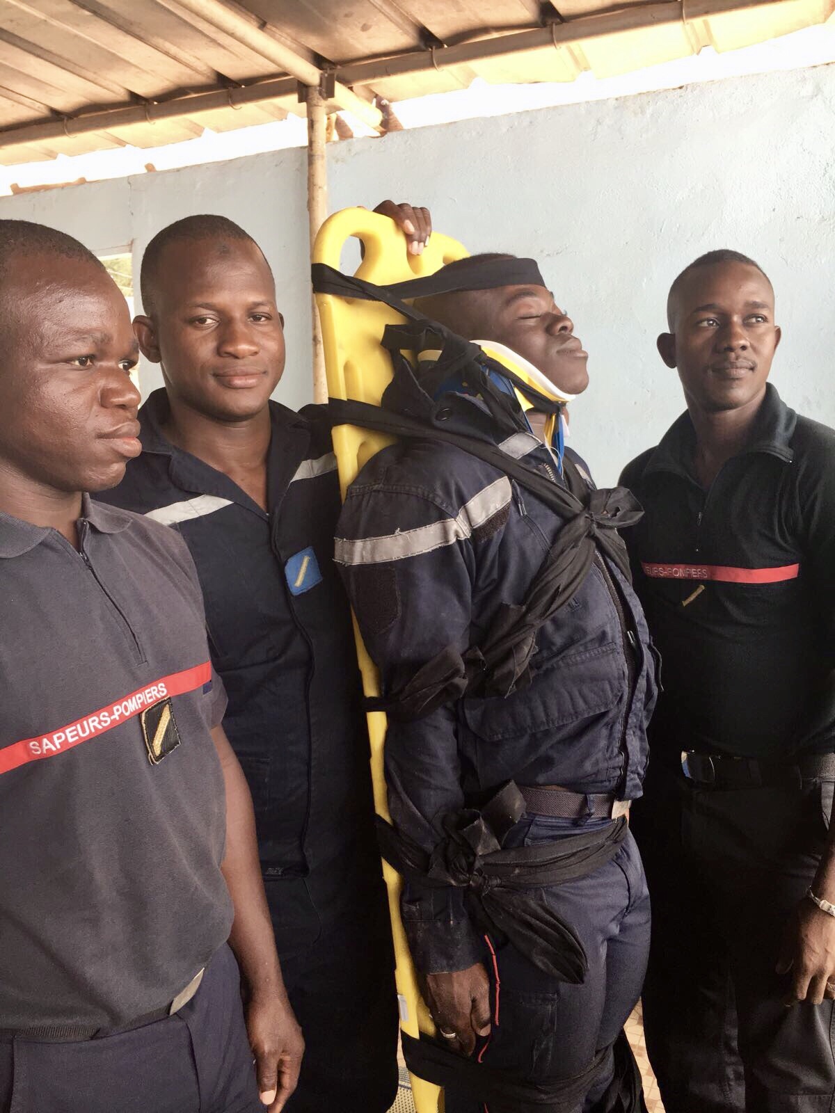 La suite de la journée a été consacrée à la révision tant théorique que pratique des différentes techniques de mobilisation et d’immobilisation des patients traumatisés. Cela a été l’occasion d’échanger sur des pratiques et de présenter le matériel (planches, civières à aube, minerves, attelles, matelas à décompression, ceintures pelviennes ) que nous avions amené dans nos bagages ! S’en est suivi une séance de photos hilare avec les pompiers immobilisés!