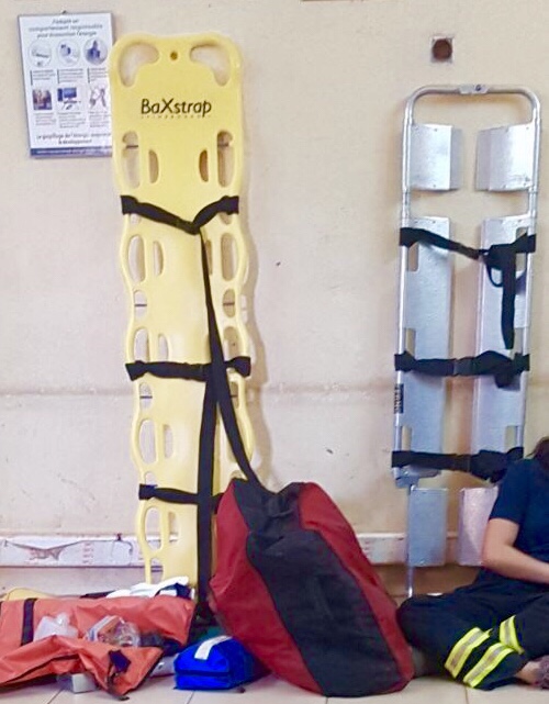Suite à nos stages sur le terrain en compagnie des sapeurs-pompiers, nous avons relevé une problématique liée au transport des patients. En effet, soit sur la planche de relevage, soit sur le brancard, l’absence de sangles provoque des mouvements souvent douloureux pour le patient qui bouge au gré des irrégularités de la route. De plus, celui-ci n’est pas du tout sécurisé pendant sa mobilisation. Nous avons donc fait construire à partir de matériel trouvé au marché des sangles à clip qui devraient dorénavant équiper chaque civière et brancard. Nous avons profité de ce projet pour conclure la journée sur cet aspect sécuritaire.