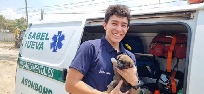 À ma grande surprise, mon premier patient se présenta pour une raison totalement inattendue. On m’avait parlé de céphalées, de douleurs abdominales, de blessures par armes blanches et armes à feu, de monstrueux accidents de la route, d’hyperglycémies, d’ACR, d’AVC, de bilan de grossesse et encore d’autres situations que l’on rencontre rarement en Suisse. Bien sûr, je serai confronté à ces interventions durant les semaines à venir, mais en attendant, une heure après mon arrivée, un des bomberos entra avec le premier patient : Esponkey, un adorable chiot, abandonné dans un sac poubelle. Un rappel brutal de la cruauté dont le monde est capable de faire preuve. Heureusement, ce petit bout d’innocence trouvera une famille quelques jours plus tard, adopté par les parents d’une bombero.