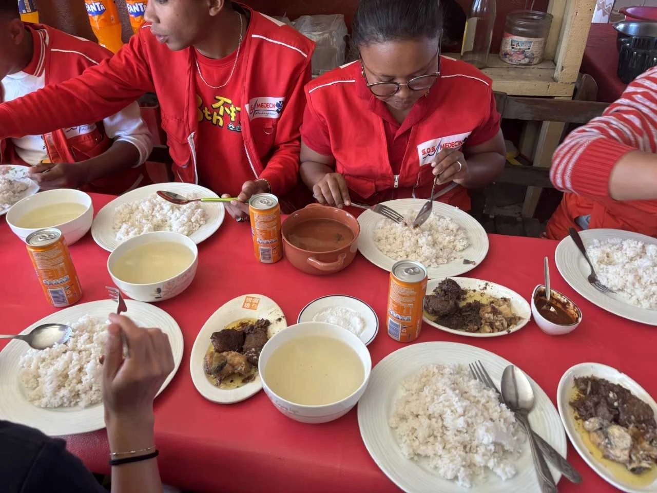 Sans grand étonnement, nous mangeons principalement du riz. Nos hôtes nous font découvrir les plats malgaches, souvent du manioc, de vary amin’n’y anana (soupe de riz) accompagné de viande et de breith.